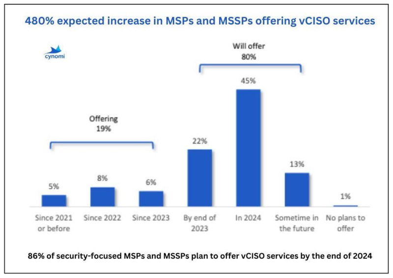 The key highlight of the report is the fact that the number of vCISO service providers is set to increase by 480% between now and the end of next year, from 19% to 86% of MSPs and MSSPs in North America. Of the current 19% that provide vCISO services, just one quarter offered vCISO services prior to 2022. This demonstrates the significant trend of adoption over the last two years that shows no signs of slowing down.