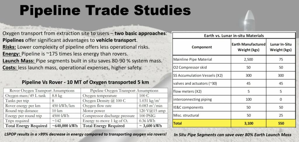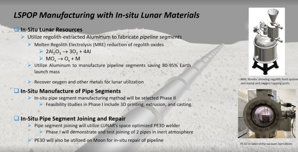 They plan to explore and assess multiple system architectures for a lunar pipeline, identify enhancing and enabling technologies, and produce a comprehensive roadmap to develop this breakthrough infrastructure. The starting concept is for a 5 km pipeline to transport oxygen gas from an oxygen production source, for example our molten regolith electrolysis (MRE) extraction site or any other source, to an oxygen storage/liquification plant near a lunar base. L-SPoP is composed of in-situ manufactured pipe segments that are passivated and welded or fitted together to span the 5 km distance. Based on preliminary analysis, we are assuming the in-situ pipe is built in modular segments from in-situ aluminum as its prevalent at the South Pole, is extractable in high purity with MRE, can be directly extruded into pipe shape, and can be oxidized to passivate. Other in-situ metals which will also be analyzed for consideration include iron and magnesium, with a lunar glass passivation coating applied through vacuum deposition onto the internal diameter of the pipe. This modular design is adaptable, repairable, and evolvable because of the in-situ resource extraction and manufacturing techniques (with occasional system upgrades from Earth), resulting in a long life for the pipeline and lower cost and risk than other approaches. The pipeline will be designed to: 1) be constructed robotically from regolith-derived metals with minimal material transferred from Earth, 2) be repairable robotically, 3) have an oxygen flow rate of ~2 kg/hour which is commensurate with the NASA initial projected need of 10,000 kg/year, 4) operate with minimal power over the lifetime of the pipeline, and 5) have a high operational reliability and be able to survive in the lunar environment for > 10 years.