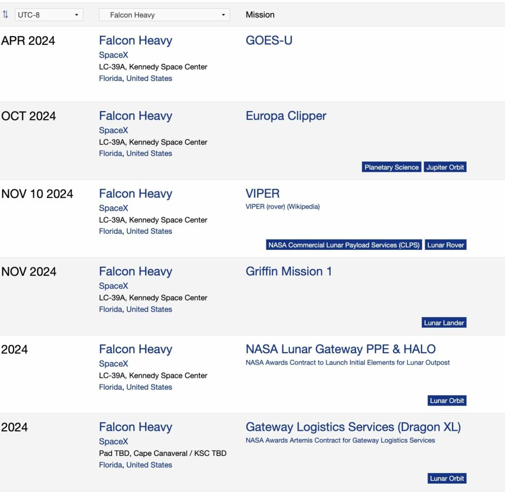 SpaceX could have as many as six launches of the Falcon Heavy in 2024. The Falcon Heavy can take as much as three times the payload of a Falcon 9.