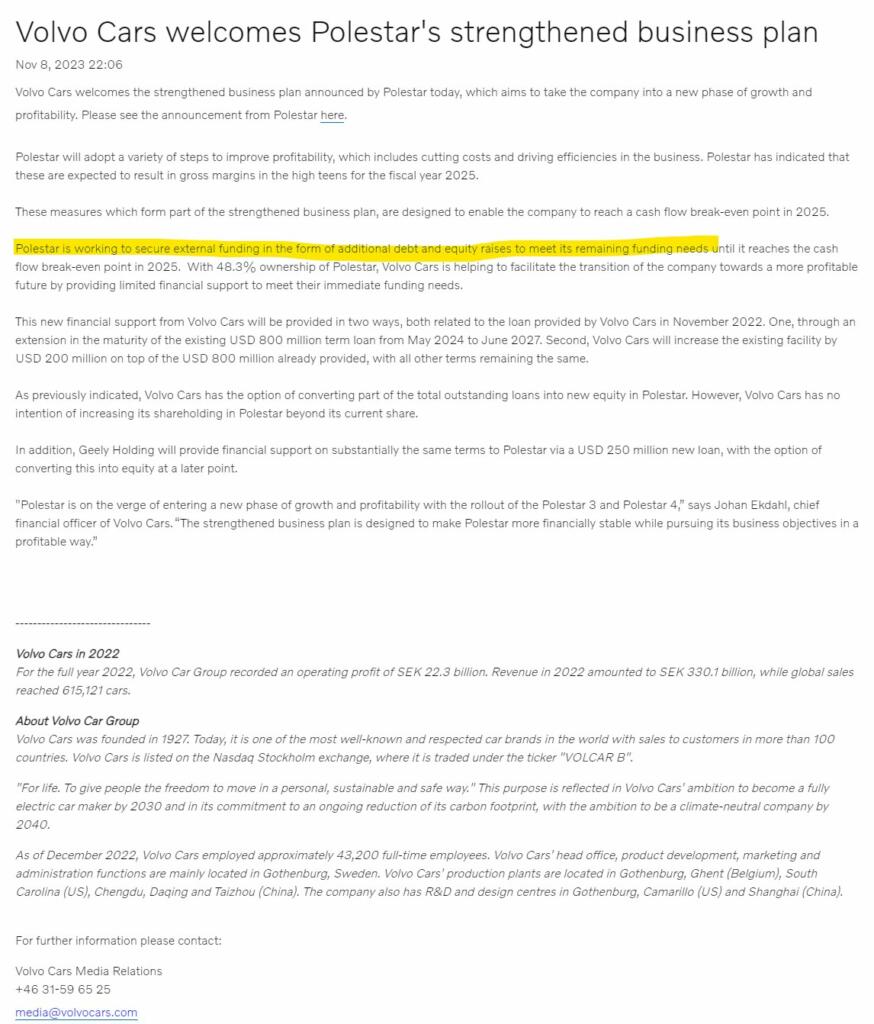 BREAKING: Polestar's immediate parent Volvo (owned by Geely) just announced that Polestar will be seeking external funding in the form of additional debt and equity raises.