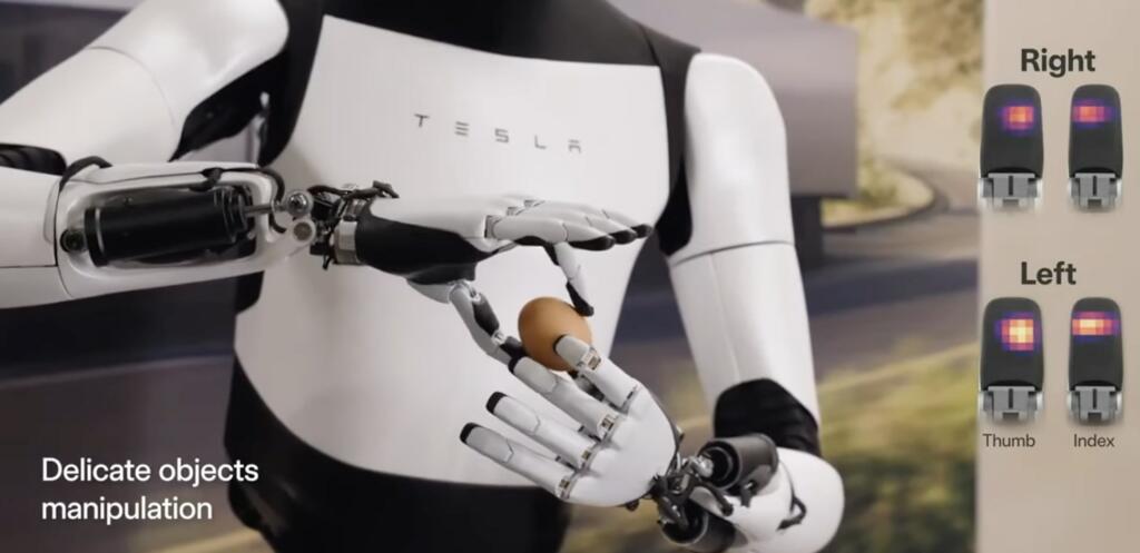 It looks like its controls are (like the sorting behaviour of the earlier version) learned by video training a neural net rather than coded in. Coding in the egg handling demo would have been excruciating and it looks like it is influenced from human input when it folds unused fingers away. So technology improving multimodal neural networks would directly improve the performance of Optimus bots.