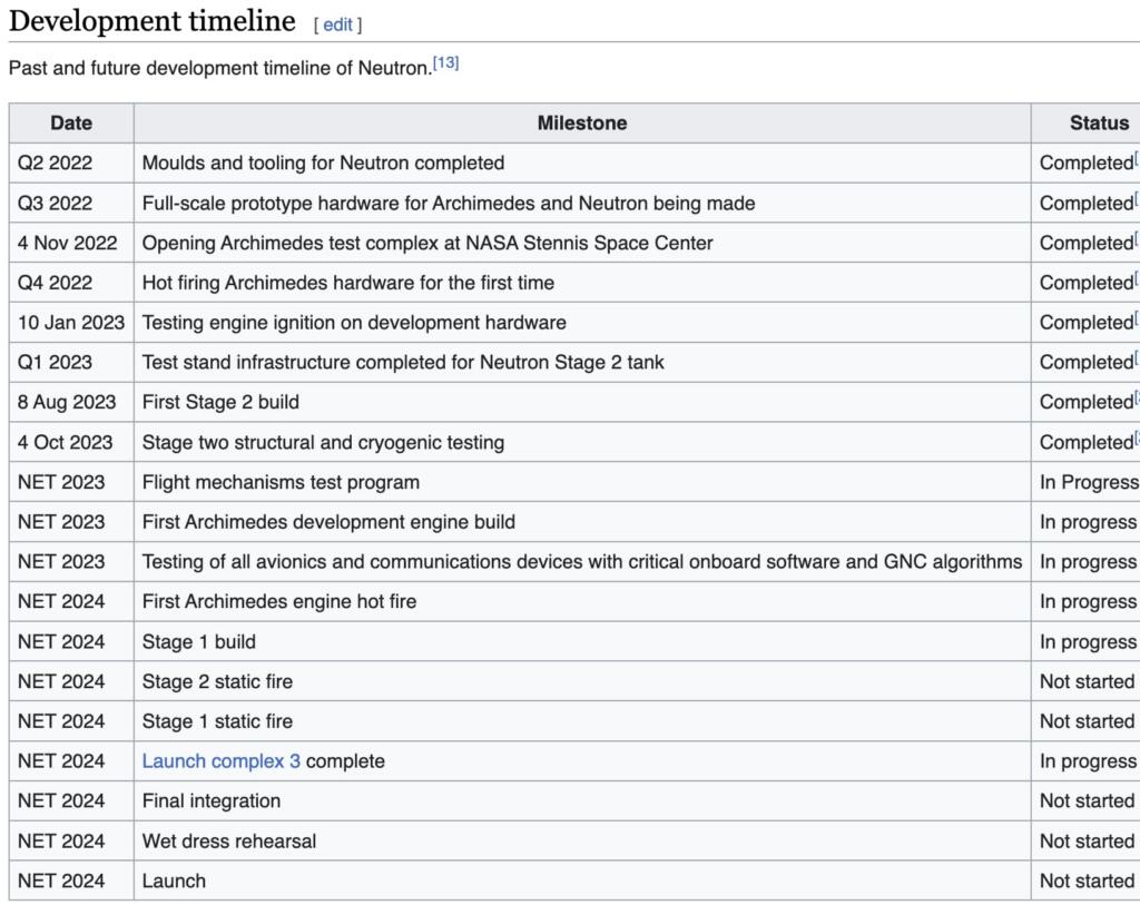 Rocket Labs is launching its Electron rocket for payloads of about 200-300 kg. They will try to launch 22 missions in 2024. They will continue developing a new engine and new rocket to reach a reusable Neutron, Falcon 9 class rocket. It is looking the engine program is a bit behind schedule and the first launch of Neutron could be in 2025 instead of 2024.