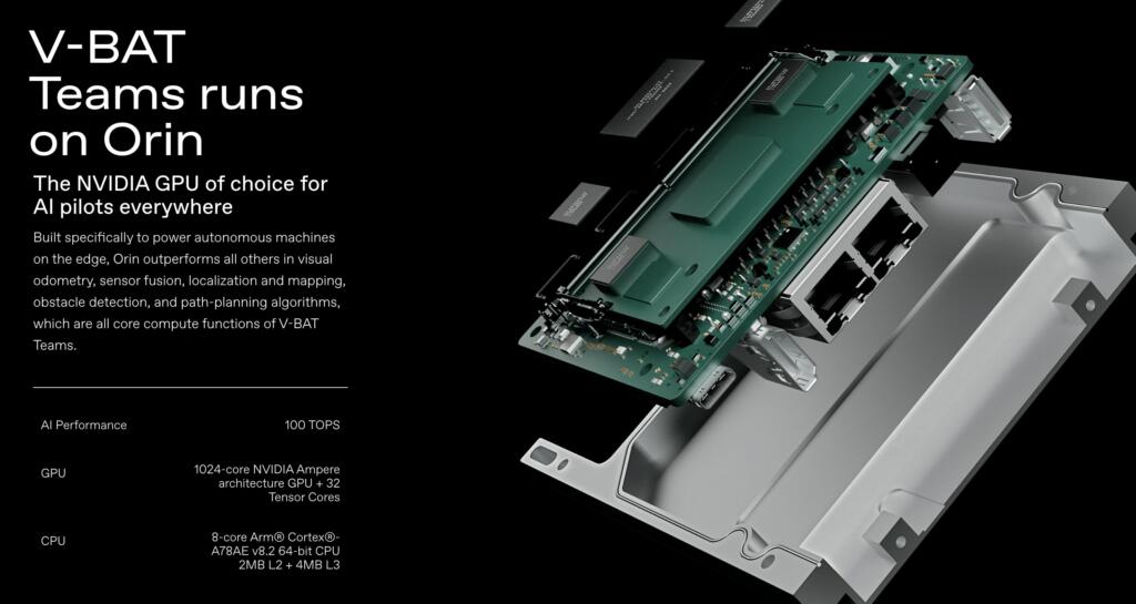 V-BAT Teams enables multiple V-BATs to autonomously execute missions in electronically contested environments while reading and reacting to adversaries, the environment, and the other V-BATs executing the mission. It comes in the form of a modular Nvidia GPU upgrade running Hivemind, Shield AI’s AI pilot, which is loaded into the modular payload bay of the V-BAT.