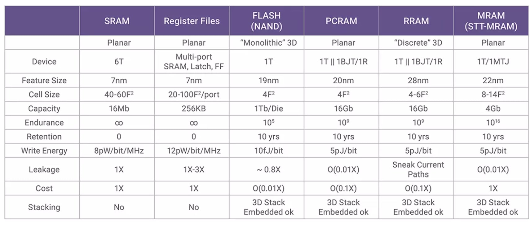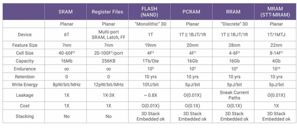 Shared features include low leakage, scalability, high retention time, and high durability, as well as ease of integration with CMOS.
