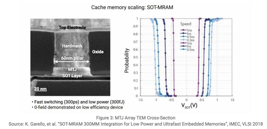 MRAM — specifically STT-MRAM and SOT-MRAM — is a non-volatile, ultra-low-power memory option fully compatible with CMOS processing. Where MRAM was traditionally slow and difficult to scale, STT-MRAM changed the game with a variable current inducing a “spin orbit torque.” STT-MRAM offers fast write times as low as 1ns and is widely used in IoT applications. SOT-MRAM is a variation that allows for even faster read and write times with identical functionality (though that comes at the price of a larger area).