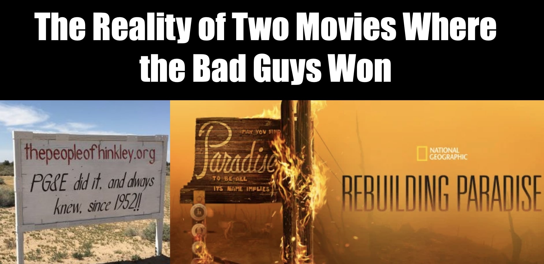 There have been two movies about the harm caused by the northern california electrical utility, PG&E. There is the Erin Brokovich in 2000 with Julia Roberts. There is Ron Howard’s documentary, Rebuilding Paradise.