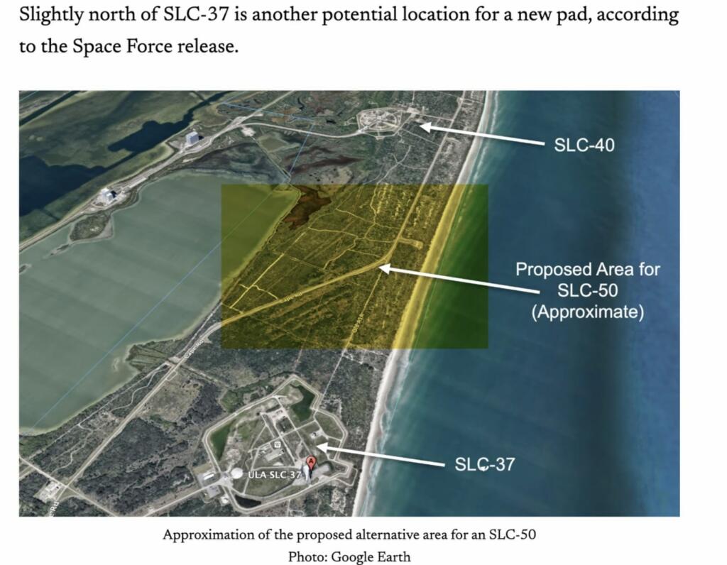 The EIS will examine one alternative option, which involves building a new launch complex designated SLC-50 for Starship. That would be located between SLC-37 and the next pad to the north, SLC-40, used by SpaceX’s Falcon 9. As is typical with such environmental studies, the EIS will include a “no action” alternative where no Starship launch sites are built at either location.