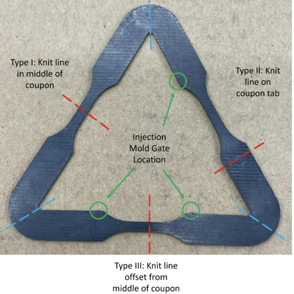 Above- Injection molded test coupons were used to test the constituent material. This injection molding part geometry yielded coupons with and without knit lines in the test region.