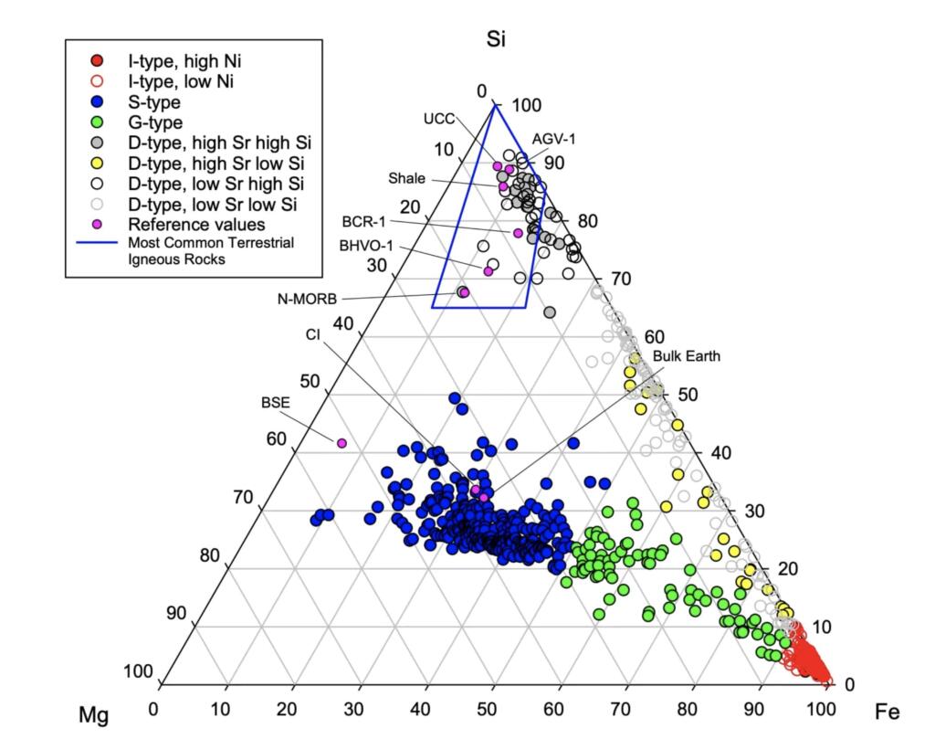 The high Si varieties of D-spherules appear close to or within the range of terrestrial igneous rocks, while the low Si groups do not. Thus, the D-type spherules have been divided into four distinct groups. This results in 8 distinct spherule groups that are all shown in the triangular diagram below.