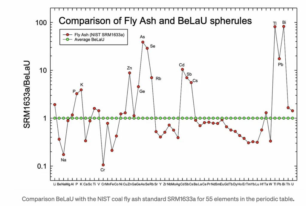 They compared the average composition of BeLaU spherules for 55 elements with the SRM1633a coal ash standard in the figure attached below. Many volatile elements (Zn, As, Se, Cd, Tl, Pb and Bi) are enriched in the coal fly ash by factors of about 10 to 100 compared to the BeLaU spherules. Some refractory elements (Be, Ca, Cr, Fe, Y, Tm, Yb, Lu and W) are depleted by factors of 3 to 10 in coal fly ash when compared to BeLaU spherules. Thus, BeLaU spherules do not have the composition of coal ash, making the aforementioned claims invalid.