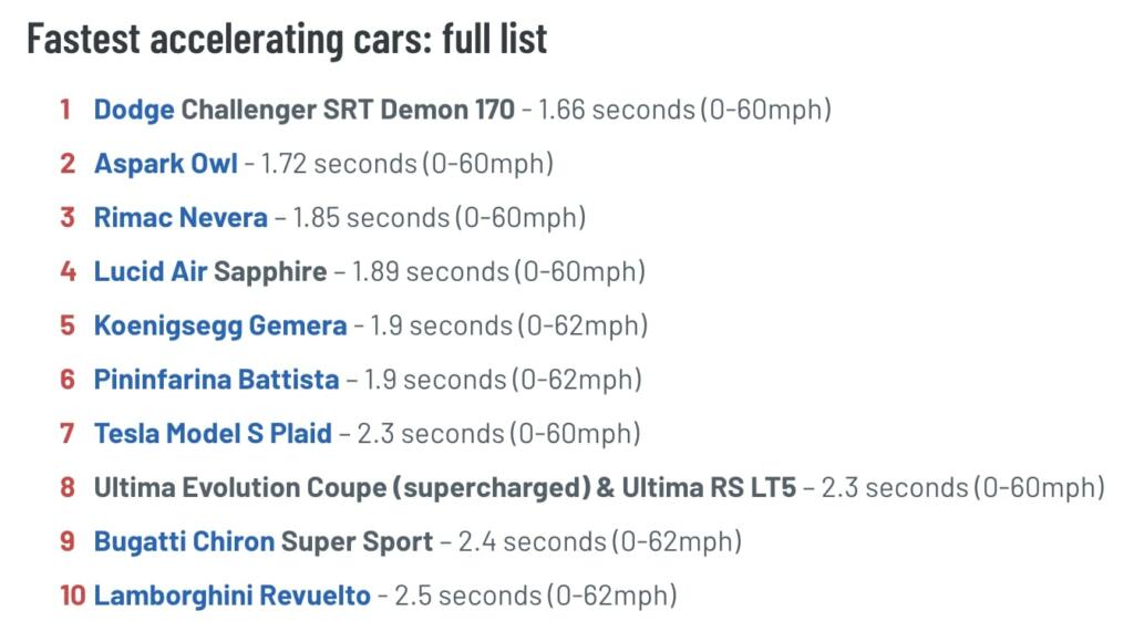 Tesla to unveil next-gen Roadster in late 2024. It’s a collaboration between Tesla and SpaceX. Deliveries aim to start in 2025. 0-60mph time is expected to be about 1 second. The best street legal 0-60 MPH is with cars in the 1.6 to 1.8 second range now.