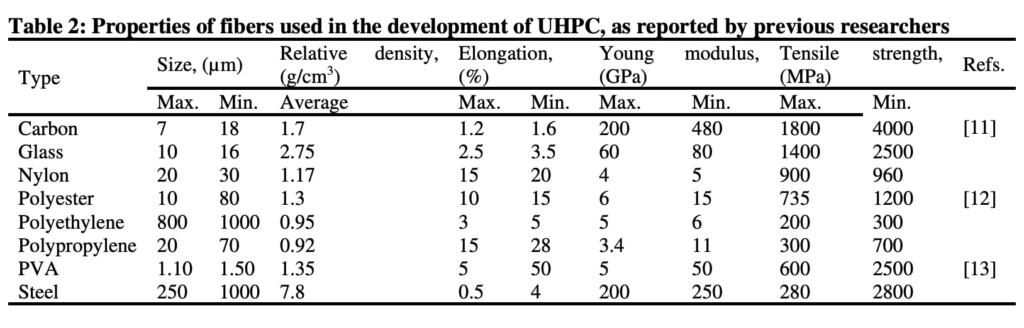 akes it a perfect material for applications where strength is a primary design criterion and concrete structural element sizes can be lowered to make them smaller, thinner, and more aesthetically acceptable. It is commonly composed of Portland cement, fine aggregate, SF, a waterreducing additive with a high range of effectiveness, and fibers.