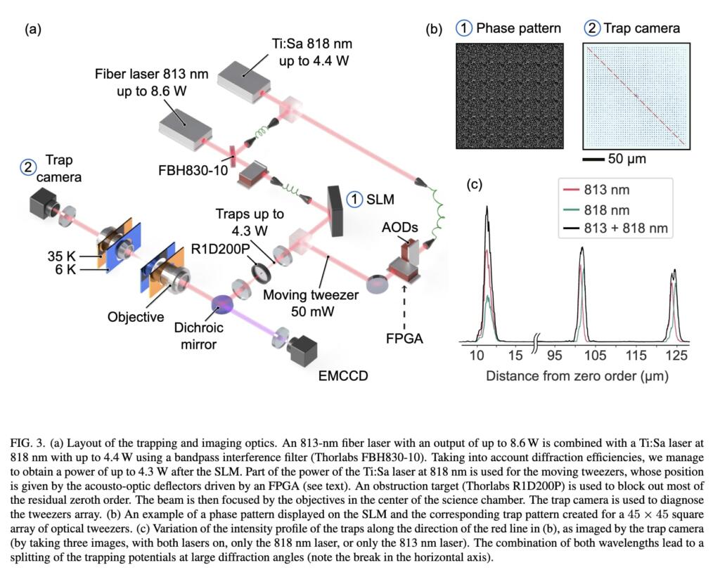 Above – FIG. 1. (a) Three possible ways to combine the use of microscope objectives and a cryogenic setup with (i) the objectives inside the cryogenic environment; with (ii) the objectives outside the vacuum chamber, or with (iii) the objectives under vacuum but at room temperature. The latter is the solution explored in this work. (b) Averaged fluorescence image of single atoms trapped in a 2088-trap array. (c) Single-shot fluorescence image in the same array, showing 1103 trapped atoms. (d) Rearrangement with a target array of 828 atoms selected from a 1824-trap array; the final array shows a ∼ 95% occupancy