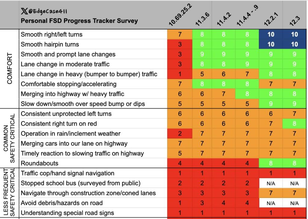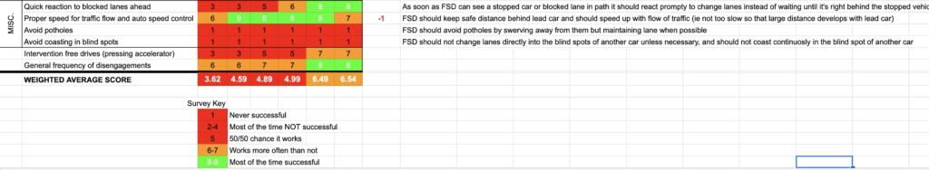 An protected left turn is a common critical safety capability and is the ninth item on the checklist of features below. The checklist was not updated for four months. There have been several improvements for 12.3.6 being able to handle many capabilities better. There has been improvement in 12.3.6 on avoiding pot holes and with understanding hand signals. The common critical safety capabilities should go from 2 out of 6 green to 6 out of 6. They were at 7 out of 10 and should be 9 or 10 out of 10 or even blue where it works all the time perfectly.