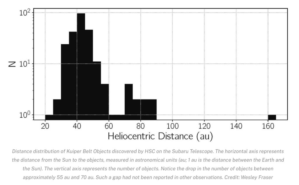 Many of the objects discovered with HSC are located at distances of 30-55 astronomical units (au) from the Sun (1 au corresponds to the distance between the Sun and Earth) and are thought to be within the known Kuiper Belt. On the other hand, the team was not expecting what appears to be a cluster of objects in the 70-90 au region and a valley between 55 au and 70 au (