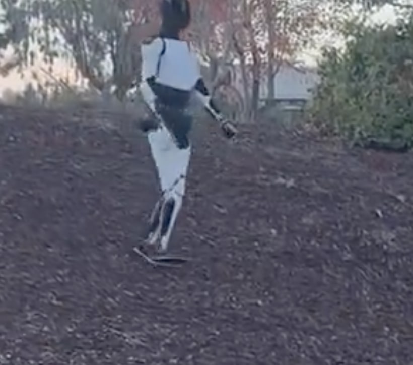 Tesla’s humanoid robot is able to walk up and down hills and mostly maintain balance.