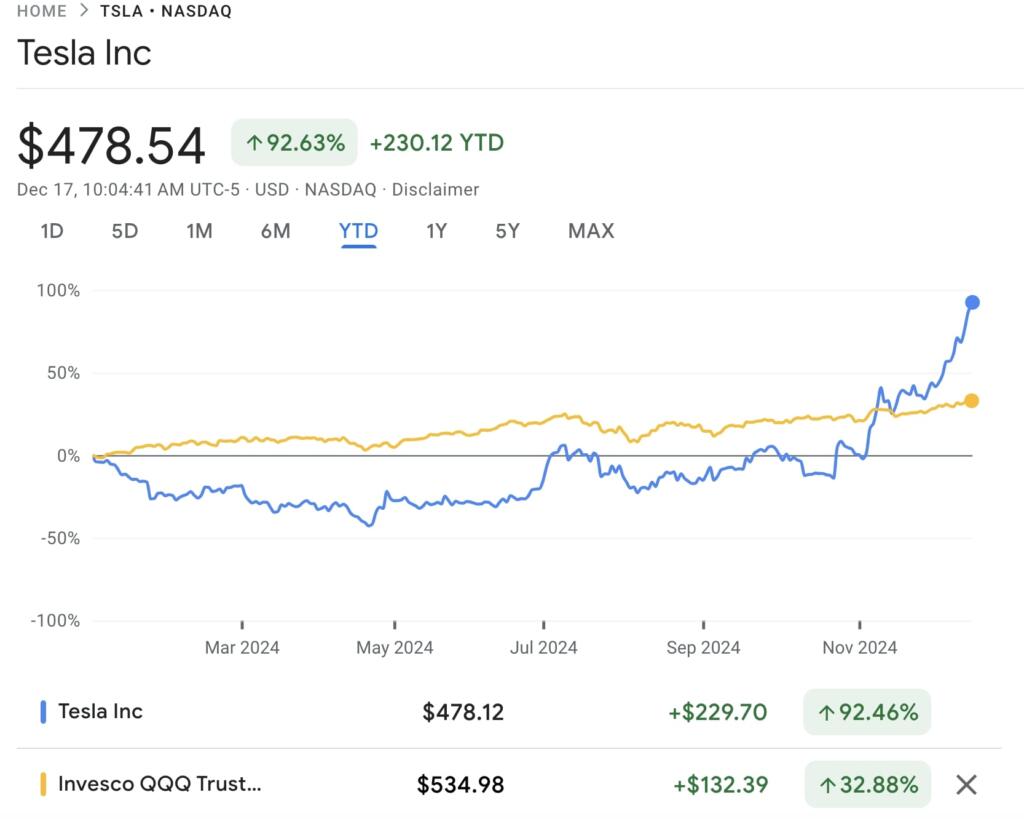 Active fund managers have their funds compared against the return of index funds. Tesla year to date is up 93% while the Nasdaq (QQQ) is up 33%.