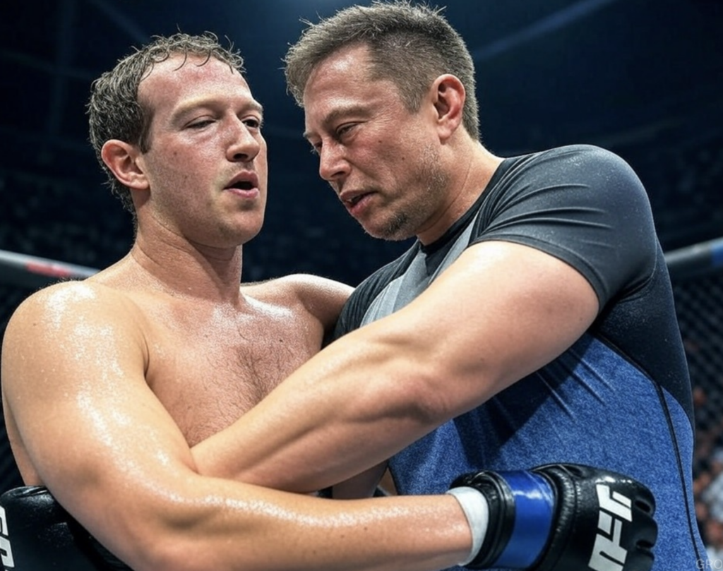 The objects are good . A cybercab looks like a Tesla cybercab. I can get it to modify by adjusting the prompt and it pretty much works. I said make Zuck and Elon look sweaty and tired and in a clinch in an MMA Octagon.