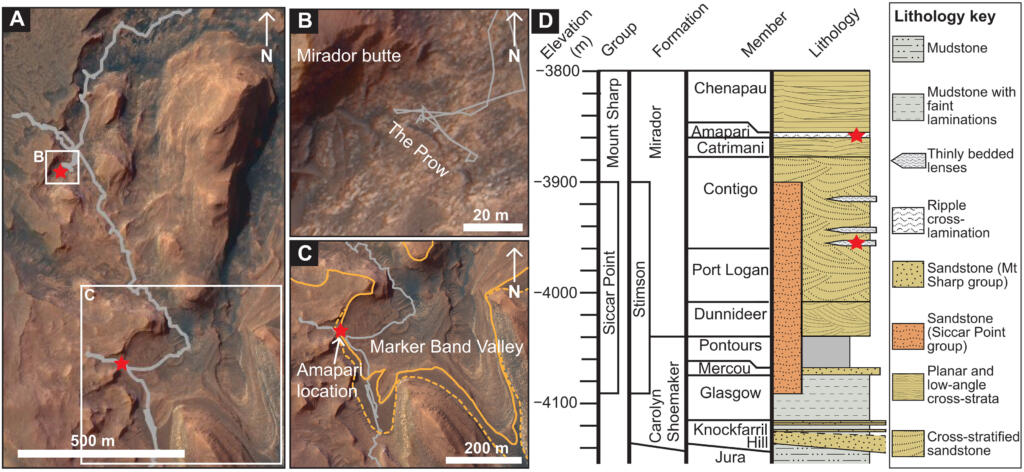 Symmetric ripple marks (A) are observed within the AMB outcrop. Ripple crests are identified with yellow arrows (A) and are aligned near-vertical (white arrow) in successive ripple layers. Internal laminae can be traced continuously through the ripple troughs. In plan view (B), the ripple crests are linear with occasional tuning-fork bifurcation, oriented consistently NW/SE. The AMB ripple unit is laterally extensive, of consistent thickness, and is conformably overlain by a unit of planar laminae [(C): contact is covered here—dotted line is inferred contact]. The AMB ripple unit at the Amapari location is ~15 cm thick and is composed of five resistant beds containing symmetric ripple marks. Image credit: NASA/JPL-Caltech/MSSS.