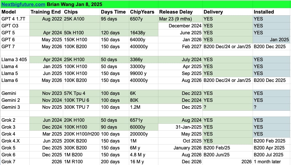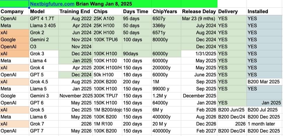 Here are estimates of the major models that have and will be released and the level of compute that will be used. This is based upon information and statements made by executives and other sources.