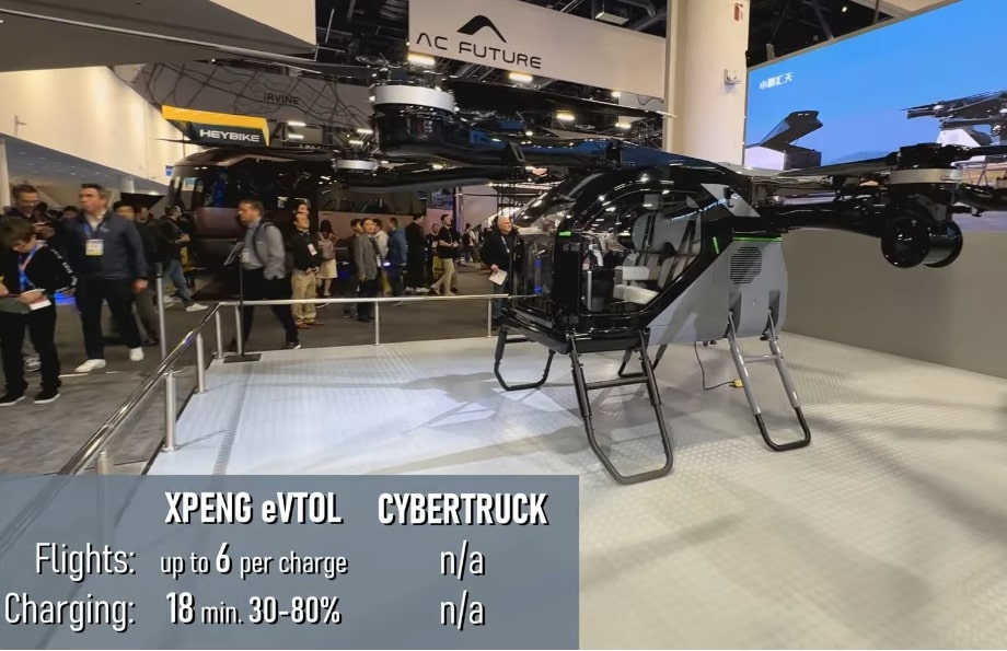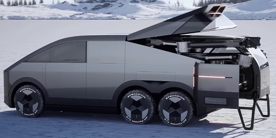 Xpeng has a hybrid six wheel van. It has a gasoline and electric engine. It has automated deployment of a two passenger eVTOL. A vertical takeoff and landing two person vehicle.
