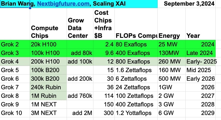 xAI is already expanding to 1.2 gigawatts of power and 1 million GPUs. Those will be Nvidia B200 chips and Dojo 2 chips of similar compute power. A million more powerful GPUs will have 40 times the training power.