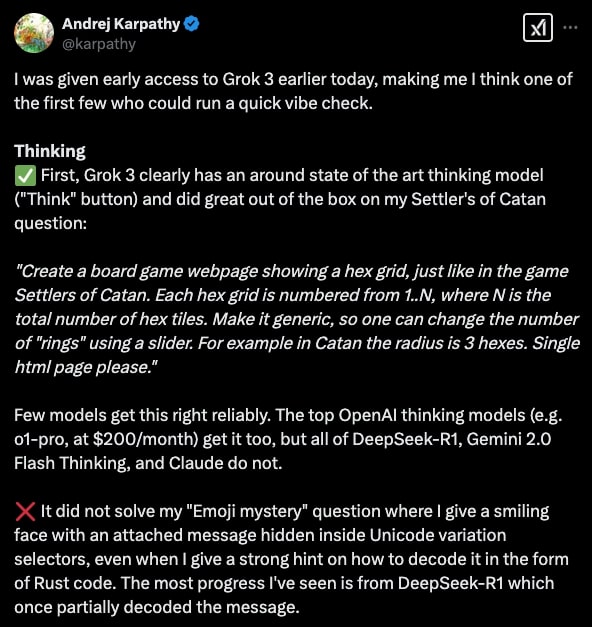 ✅ First, Grok 3 clearly has an around state of the art thinking model ("Think" button) and did great out of the box on my Settler's of Catan… pic.twitter.com/qIrUAN1IfD— Andrej Karpathy (@karpathy) February 18, 2025