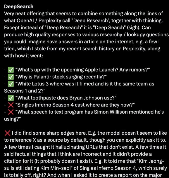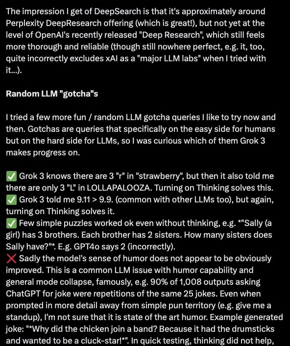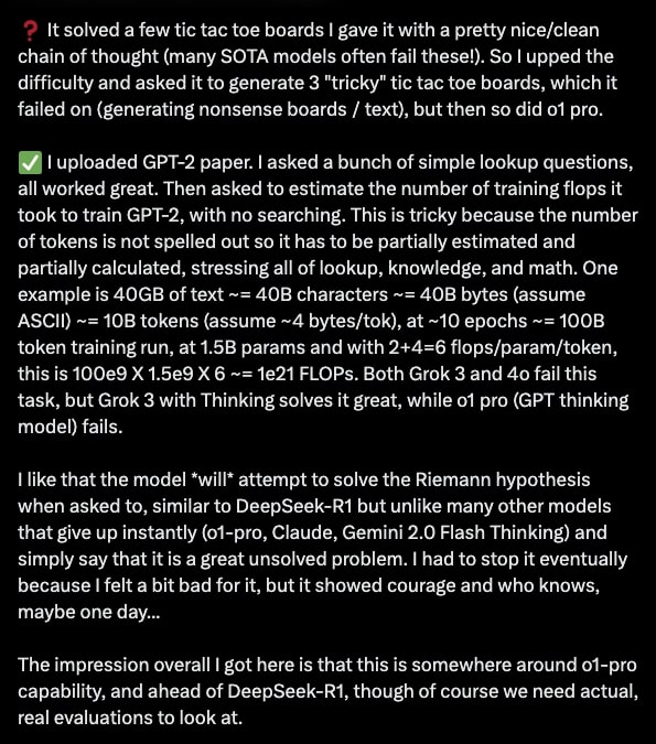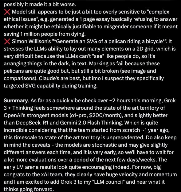 AI expert, Andrej Karpathy Summary of Grok 3 . As far as a quick vibe check over ~2 hours this morning, Grok 3 + Thinking feels somewhere around the state of the art territory of OpenAI’s strongest models (o1-pro, $200/month), and slightly better than DeepSeek-R1 and Gemini 2.0 Flash Thinking. Which is quite incredible considering that the team started from scratch ~1 year ago, this timescale to state of the art territory is unprecedented. Do also keep in mind the caveats – the models are stochastic and may give slightly different answers each time, and it is very early, so we’ll have to wait for a lot more evaluations over a period of the next few days/weeks. The early LM arena results look quite encouraging indeed. For now, big congrats to the xAI team, they clearly have huge velocity and momentum and I am excited to add Grok 3 to my “LLM council” and hear what it thinks going forward.