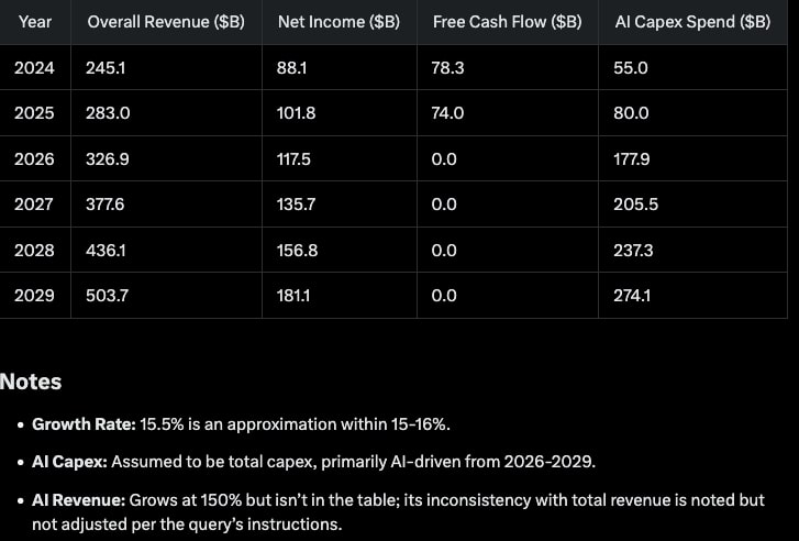 If this happened for Microsoft, then it would mean increasing AI and research to about $250-300 billion from Microsoft alone. The 15% per year growth in revenue and net income could support the growing investment shown below.
