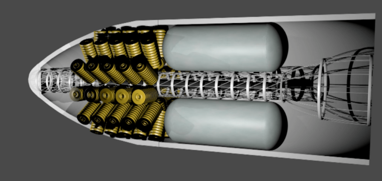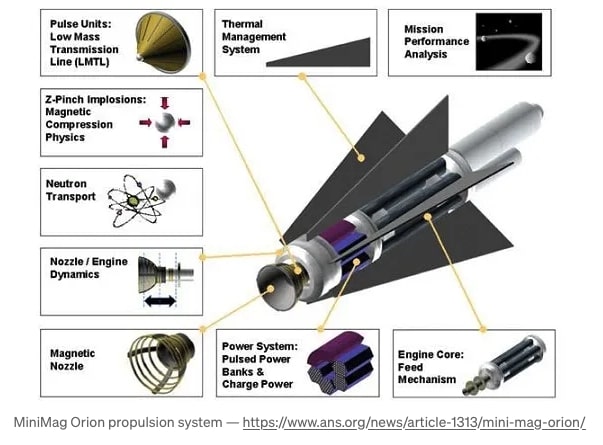 Andrews Space in the early 2000s proposed Mini-mag orion. Mini-Mag Orion uses magnetic fields to compress and ignite small nuclear pellets, offering a more controlled and potentially more efficient alternative to the traditional pusher-plate design. This approach could reduce the spacecraft’s size while maintaining high thrust and specific impulse (up to 10,000 seconds).