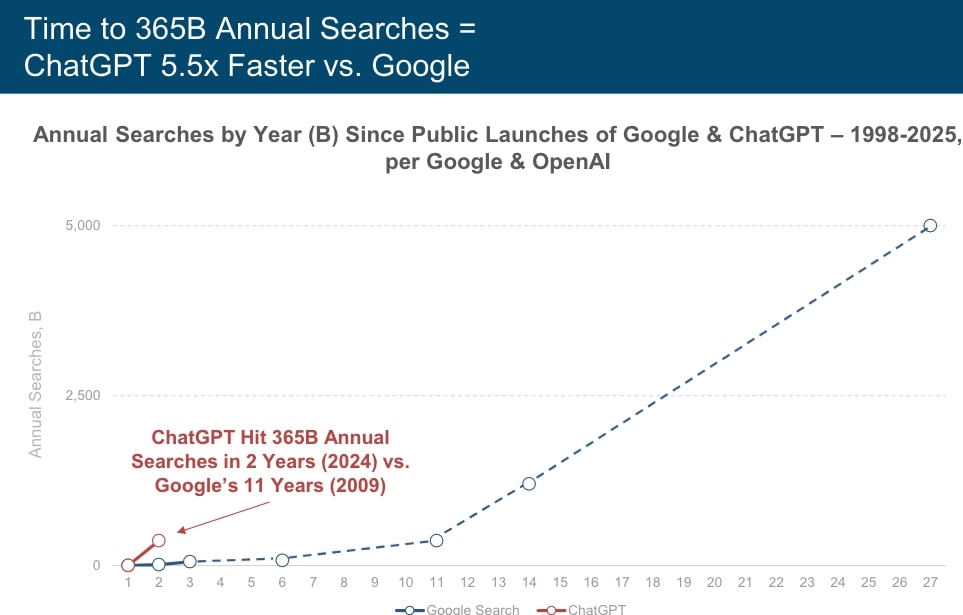 Usage, Adoption, and Engagement: AI chatbots (proxy: ChatGPT) see rising daily/weekly use across ages/groups, carving ~20 minutes/day from users (inflecting up with better models). Retention improving toward Google Search levels.