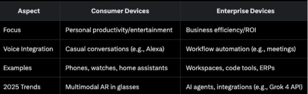 Enterprise vs. Consumer: Enterprise focuses on productivity (e.g., workflows, integrations with Outlook/Zooms), while consumer emphasizes entertainment and daily use. Privacy, bias, and ubiquity are critical for scaling.