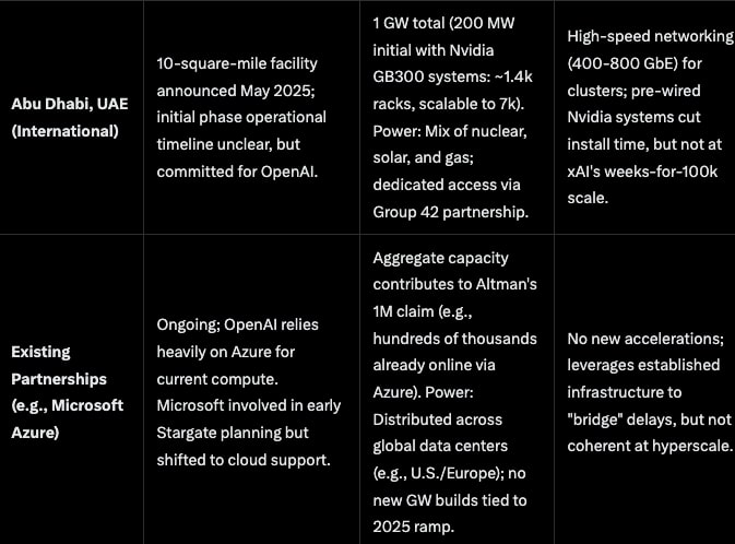xAI’s Colossus in Memphis, TN, sets the benchmark for fast, coherent GPU clusters (unified memory across chips for efficient training). OpenAI hasn’t matched this yet— their approach uses multi-datacenter setups, which enable scale but sacrifice single-cluster coherence due to latency/network issues.