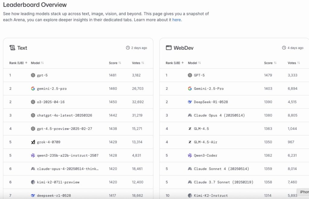 GPT5 is the number one model per the LMArena leaderboard with a 1481 score and 1460 for Gemini and 1429 for Grok 4. There are other OpenAI models on the board but the other OpenAI models were deprecated.