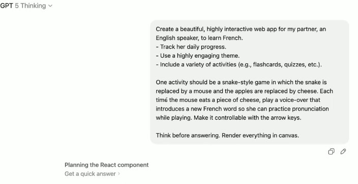There was a vibe coding demo for using OpenAI GPT5. It uses flashcards and verbal pronounciation and has an interactive game in the educational product.