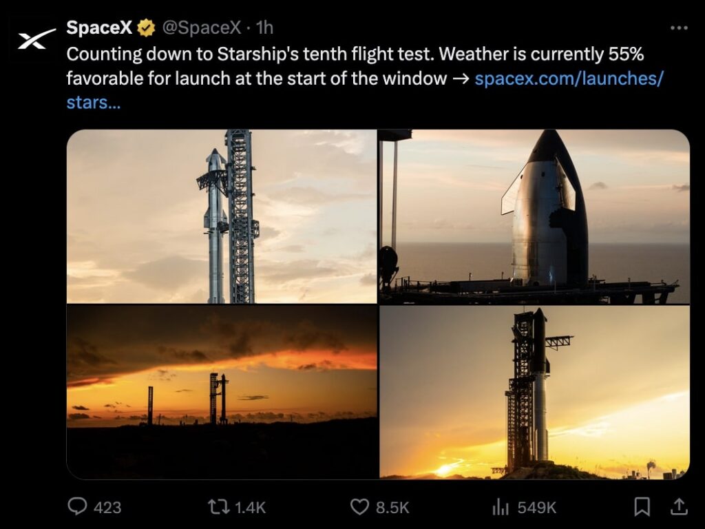 Counting down to Starship's tenth flight test. Weather is currently 55% favorable for launch at the start of the window → https://t.co/UIwbeGoVS9 pic.twitter.com/s4GiykTfdg