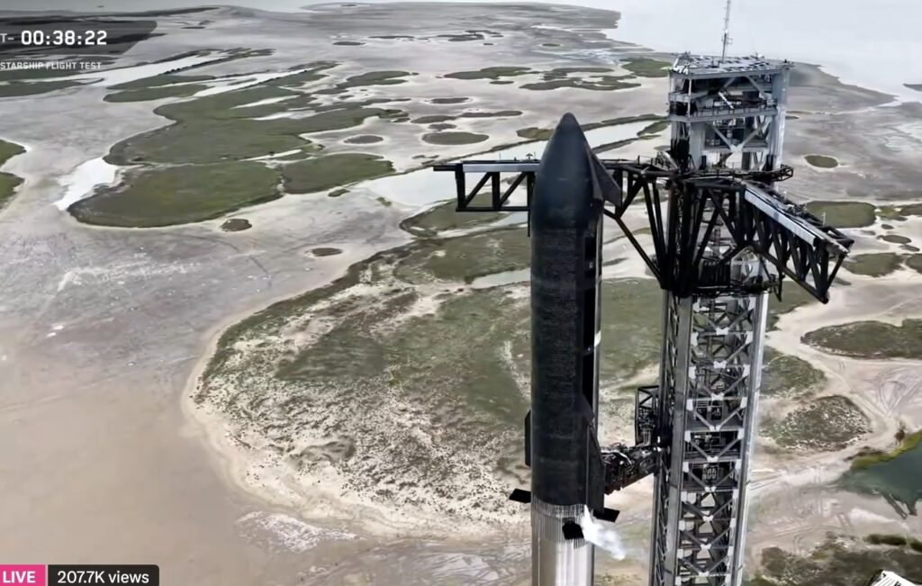 The vehicle consists of Super Heavy Booster 16 (Block 2) and upper-stage Ship 37. Musk described Starship as “the largest flying object ever made,” with twice the mass of NASA’s Saturn V rocket and ultimately three times the thrust (over 10,000 metric tons at liftoff).