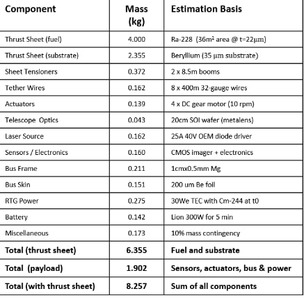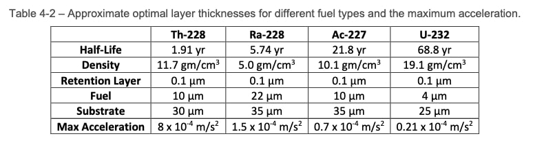 o Thrust model validation – the forces generated by a sheet should be validated by using a readily available alpha emitter fuel with a short half-life.