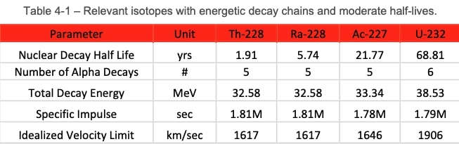 An important aspect of the proposed concept is that it relies almost entirely on well-known effects or modifications of existing technology. Although there is still substantial risk and arduous engineering challenges ahead, no impassable roadblocks have been identified. The possible exception is the path to isotope production. Although this isn’t a fundamental limitation, there are likely to be programmatic challenges to the nuclear facility build-out for scaling up in the near term. This can be addressed by considering near term missions which leverage less energetic isotopes and/or smaller systems which utilize smaller quantities of materials. In parallel, novel approaches to production should be developed to ensure a fuel supply is available for all desired missions. Safety precautions need to be taken to ensure the safety of personnel and the environment in the event of a launch or other type of accident scenario.