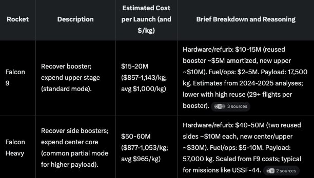 Starship Version 3 is expected to fly by late 2025 and features stretched tanks and improved engines for higher payload. It will have payloads of 200 tons (200,000 kg) reusable to LEO, ~250 tons (250,000 kg) partial reuse, and ~300 tons (300,000 kg) expendable. Costs are internal/marginal estimates based on production scaling ($35-60M per stack long-term), reuse rates, fuel (~$1M), and operations. Cost/kg is launch cost divided by payload mass.