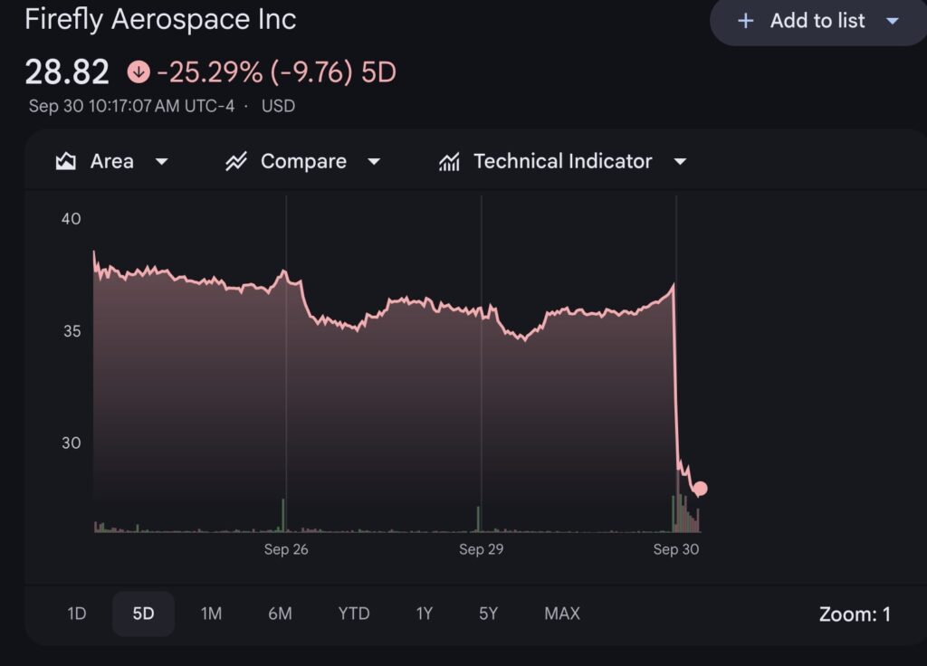 Firefly Aerospace’s first stage booster for its seventh Alpha rocket flight exploded on September 29, 2025, during a routine acceptance test at the company’s Briggs, Texas facility, destroying the booster and damaging the test stand with no injuries reported. The incident was around 3 p.m. local time, has prompted an investigation into the anomaly and indefinitely delays the commercial mission planned for Vandenberg Space Force Base. Firefly was founded in 2017 by CEO Tom Markusic. The Alpha rocket has had six prior flights with mixed success. The stock has dropped about 25%.