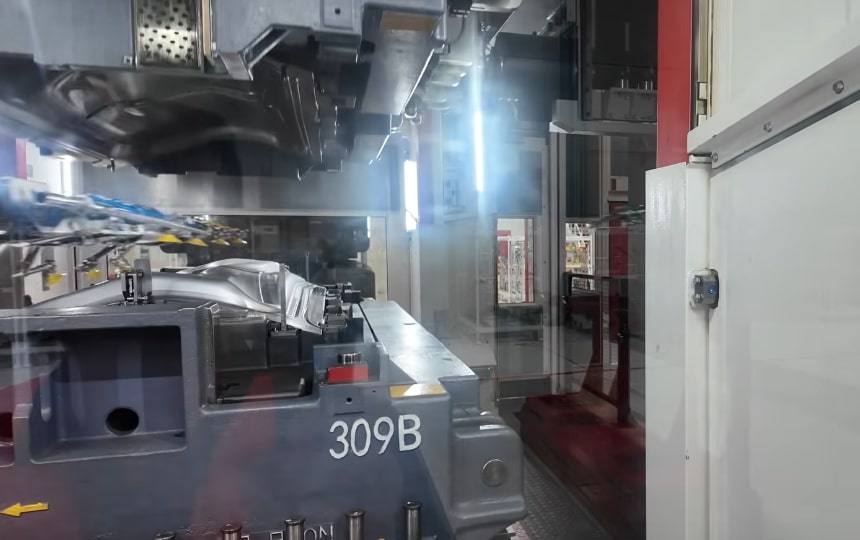 Raw aluminum ingots/blanks are melted at 700°C and injected into molds using the world’s largest die-casting machine (6,000 tons of pressure). The liquid aluminum is pressed and cooled rapidly.