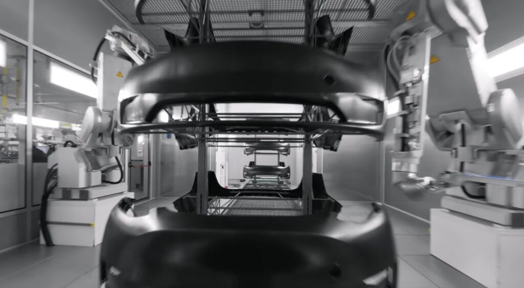 Two fully automated lines with 150+ robots; robots open doors, tailgates, frunk for painting.