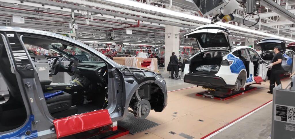 GA overview: ~1,000 employees/shift. 7 main lines + secondaries. Installs wheels, seats, doors, windows. Bodies connect to powertrain (battery, axles, motors).