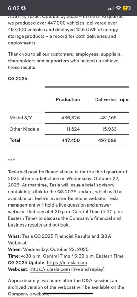 495,000–505,000 vehicle deliveries. Adjusted from prior quarter plus adjustments for inventory drawdown (from Q2’s +26,000 excess). Europe (+13,000 to ~65,000), US growth (from 150,000 to 200,000, driven by EV market strength as seen by GM/Ford and expiring $7500 credit), and China (240,000 up from first two months of quarter 150,000 + 90k from September push). For energy storage: A bold 15 GWh, citing potential surges in production.