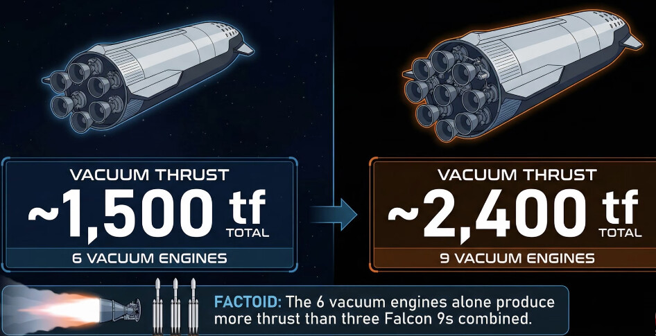 The Starship upper stage changes from 6 engines (3 sea-level Raptors and 3 vacuum-optimized Raptors) to 9 engines. It has 3 sea-level and 6 vacuum variants.