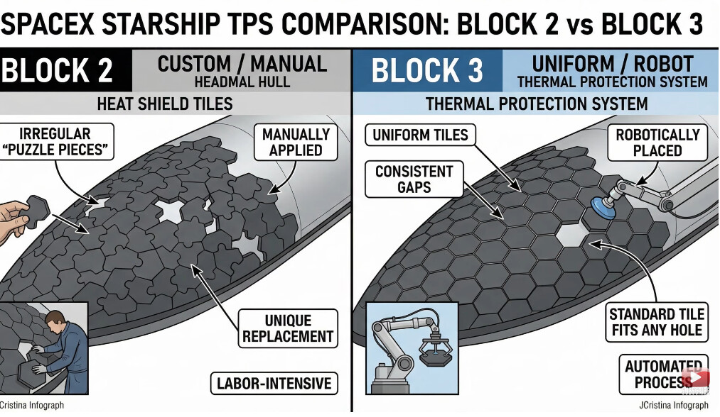 SpaceX’s Starship Block 3 (aka Version 3 or V3) is a huge shift from prototyping to scalable mass production. SpaceX is focusing on enhancing reliability, reducing costs, and enabling high-volume manufacturing to support ambitious goals like frequent Mars missions and expanding the Starlink constellation. Key advancements include automated assembly processes, particularly for the heat shield tiles.