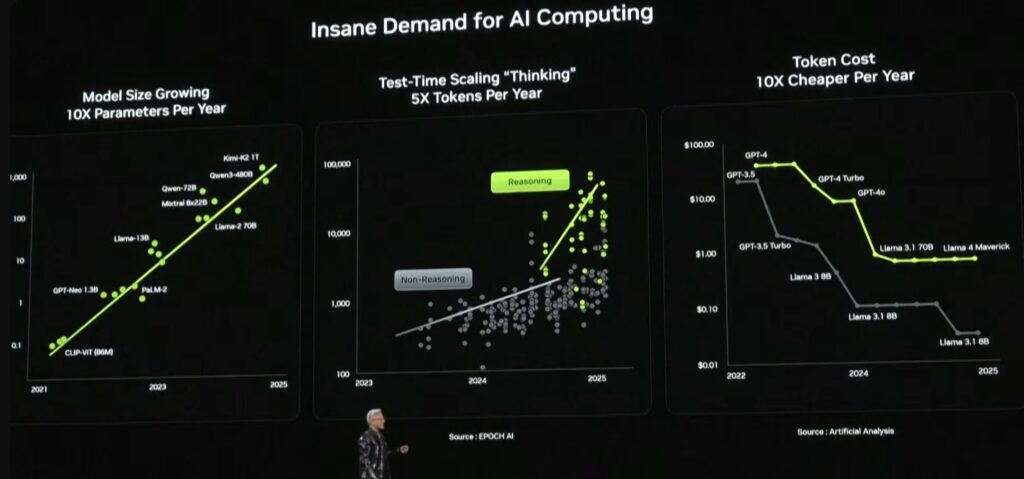 Post-training uses reinforcement learning and inference is multi-token. Tokens use increase 5x yearly. Costs decline 10x yearly due to race.